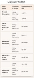 Rennspiele wie F1 2025 laufen in 1440p mit rund 46 FPS auf „Ultra High“-Details, in 1080p sogar über 67 FPS – flüssiges Gameplay ist also garantiert.